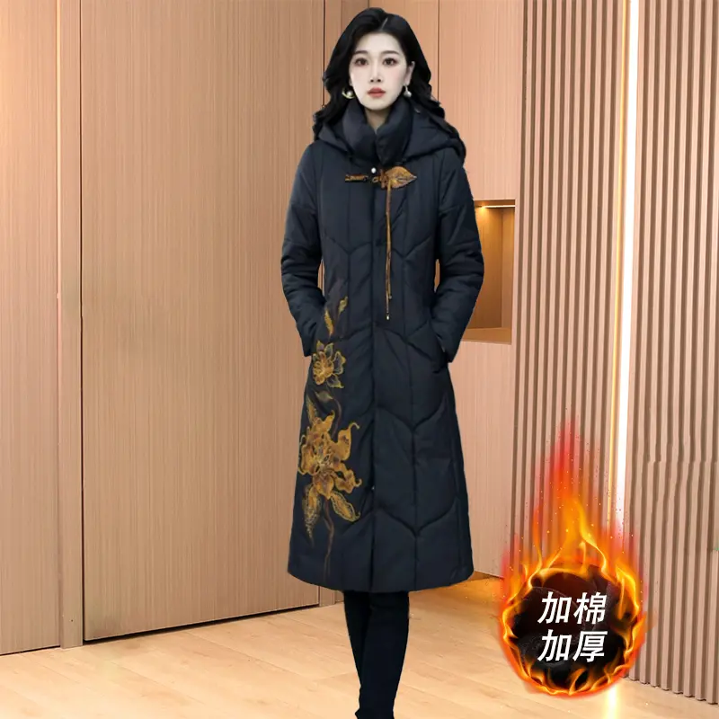 2025冬季中国刺绣风连帽中长款棉服女修身加厚保暖洋气棉袄外套
