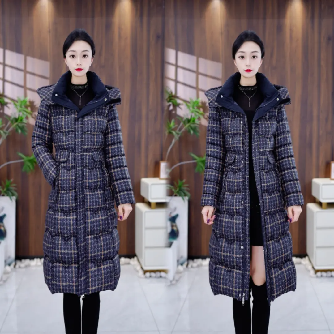 2025冬季格纹连帽棉服女中长款修身显瘦加厚保暖时尚棉衣外套