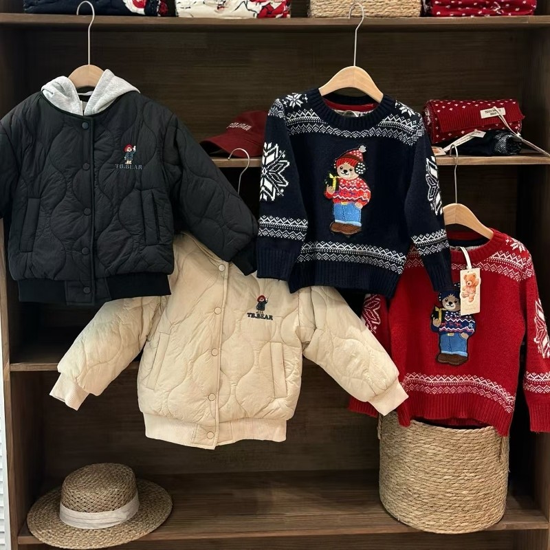 圣诞款中大童25秋冬雪花刺绣毛衣围巾男女童小熊保暖连帽棉服棉衣