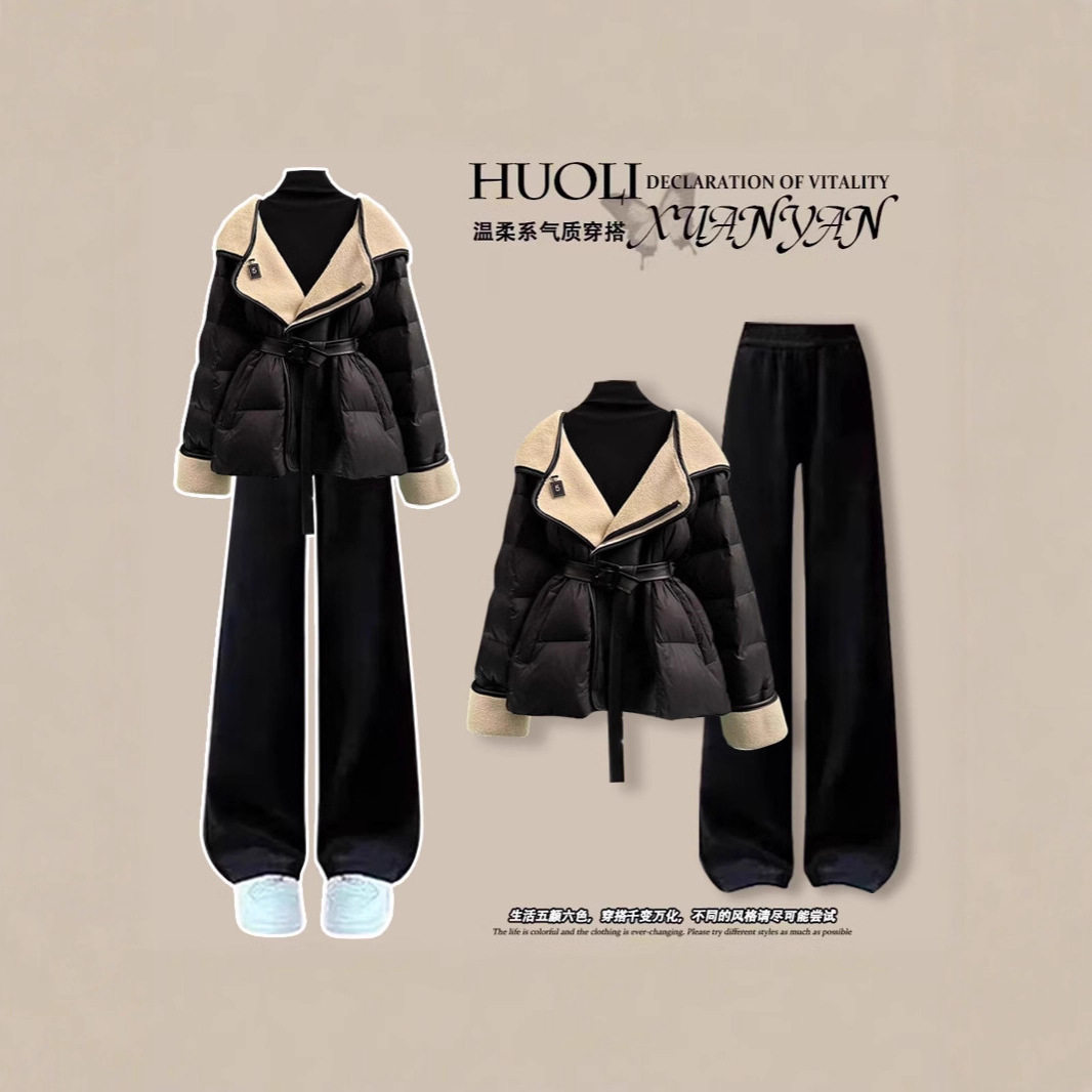 春季套装女2025时尚新款高级感保暖加绒连帽棉衣高腰阔腿裤两件套