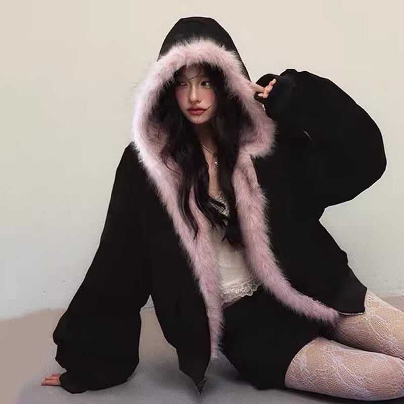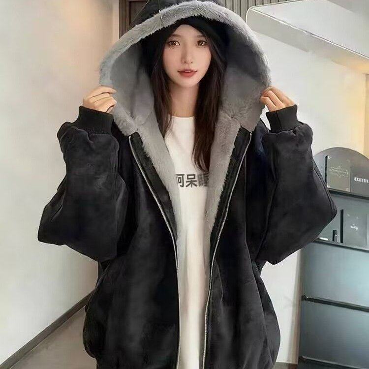 美式连帽座山雕皮衣棉服女冬季2025新款加厚保暖羊羔毛绒棉衣外套