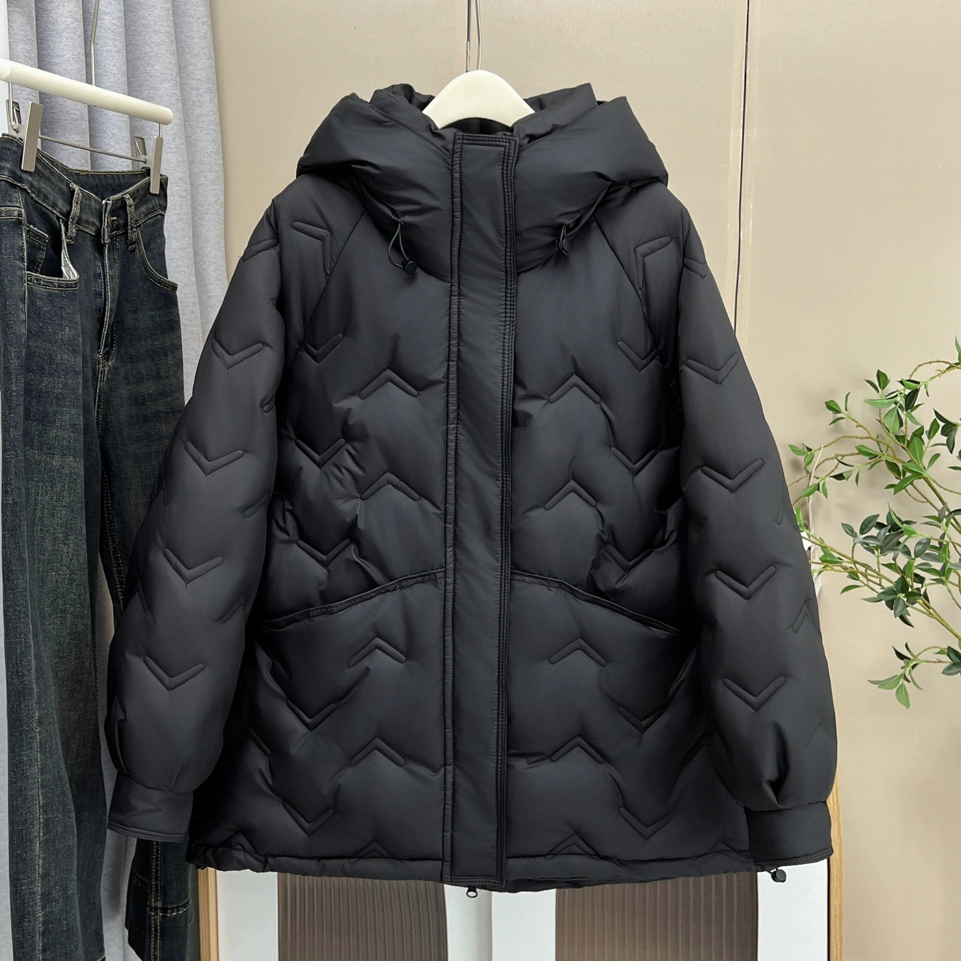 大码棉衣女2025冬季新款简约通勤中长款大口袋连帽棉服200斤外套