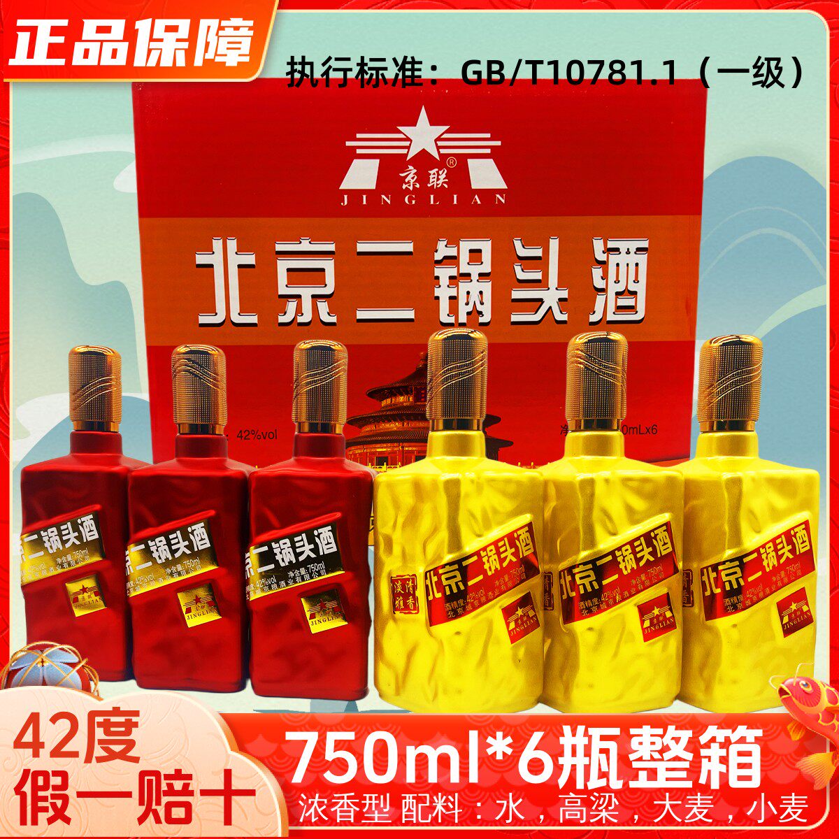 北京二锅头42度小方瓶浓香型纯粮食高粱酒750ml*6瓶白酒整箱特价