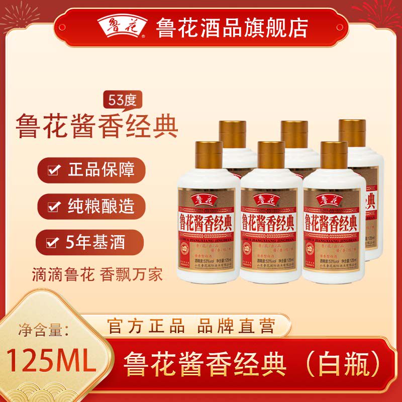 鲁花旗舰店53度白瓶酱香经典整箱125ml*6厂家直销伴手礼小瓶酒