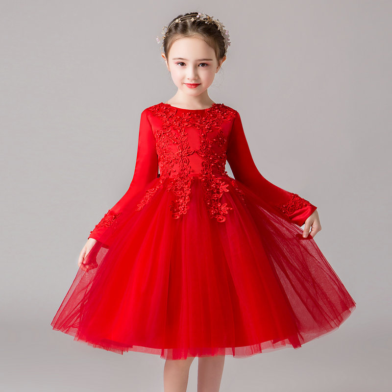 春秋冬季儿童红色公主裙蓬蓬裙女童连衣裙长袖纱裙子舞蹈演出礼服