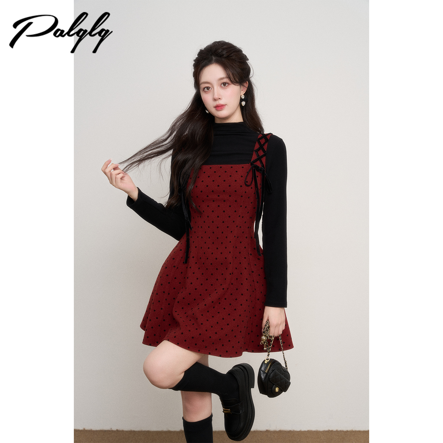 法式红色波点背带连衣裙女2025年秋冬新款气质打底蓬蓬裙a字裙子