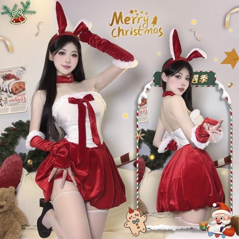 圣诞节穿搭红色抹胸连衣裙女秋冬季性感辣妹气质收腰蓬蓬裙演出服