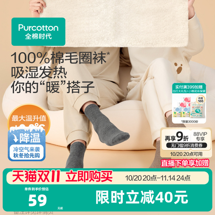 全棉时代男女士毛圈袜中筒袜加绒保暖袜冬季袜子纯棉运动袜厚袜子