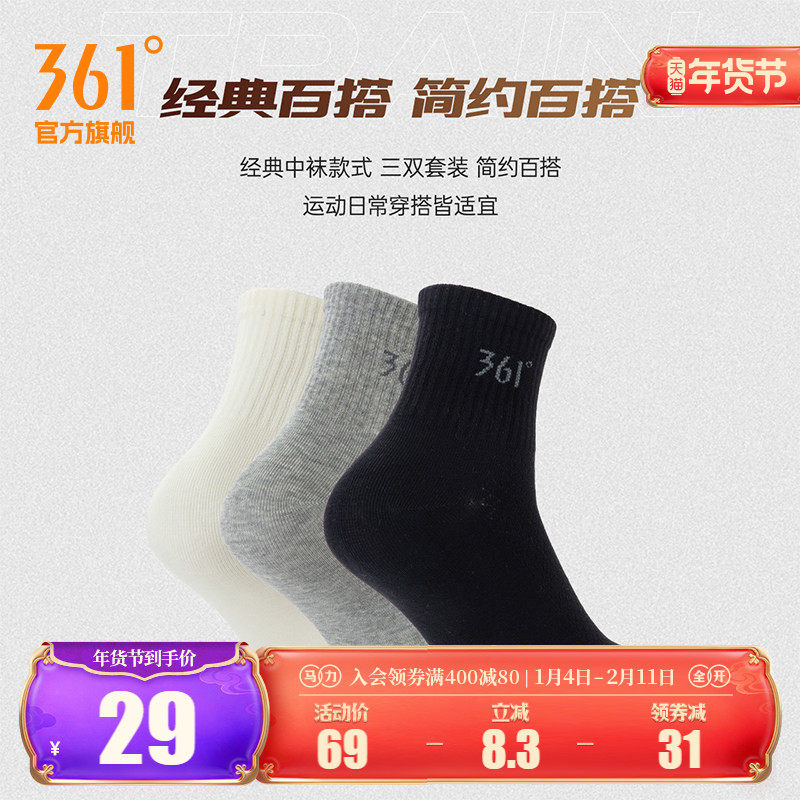 361度男中筒白袜运动长筒棉袜秋冬季三双装防臭吸汗纯色黑色长袜