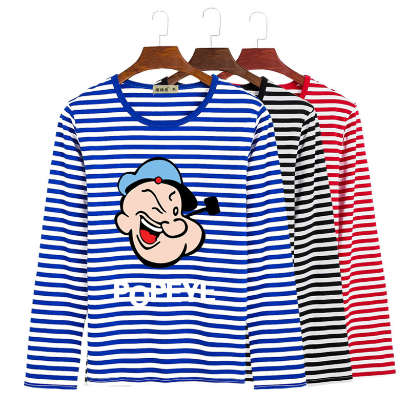 潮大力水手吃菠菜条纹长袖复古动漫人物头像海军风男士海魂衫T恤