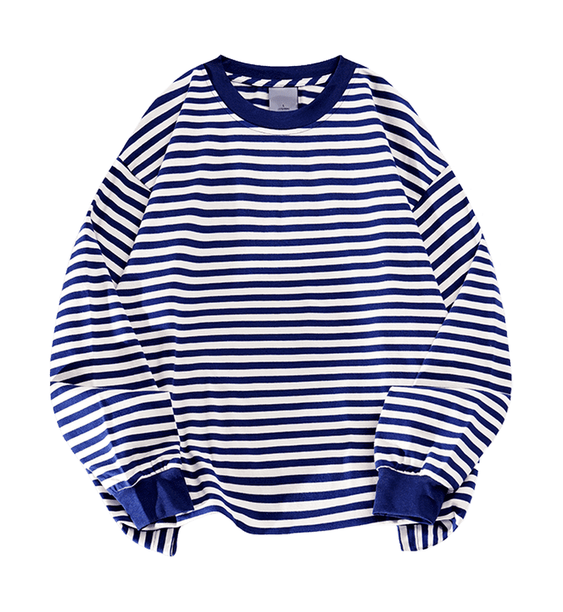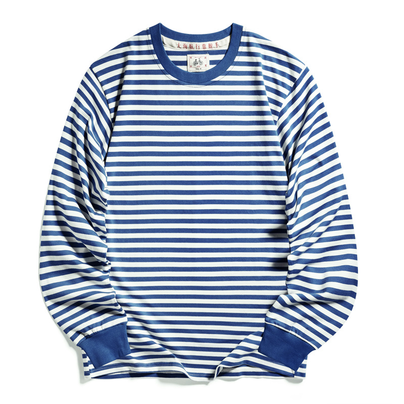 纯棉海军蓝条纹长袖T恤海魂衫男女款水手服圆领落肩宽松透气舒适