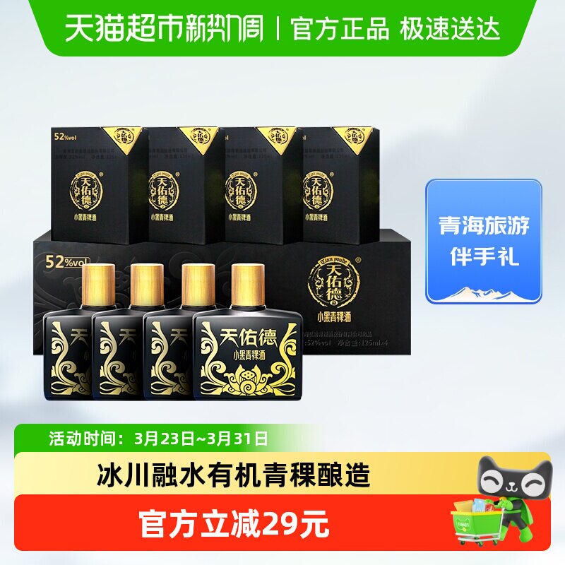 天佑德青稞酒小黑礼盒52度125ml*4瓶清香型白酒青海湖特产送礼