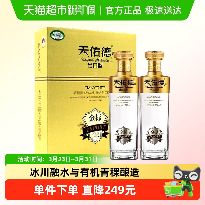 天佑德有机清香型白酒45度金标出口型750ml*2瓶青稞酒礼盒装