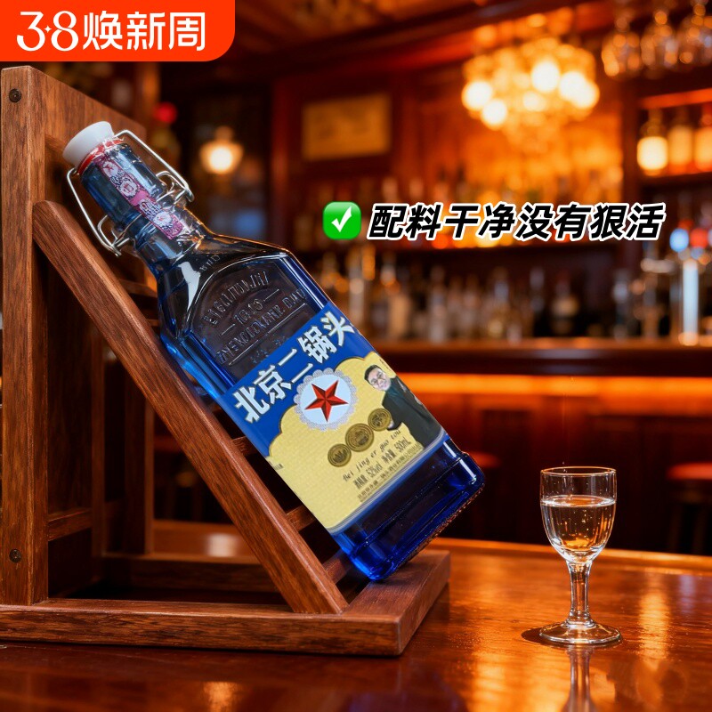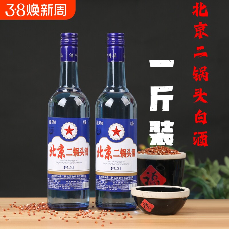 白酒42度浓香型500ml*2瓶北京二锅头蓝方瓶纯粮酒绵柔好喝口粮酒