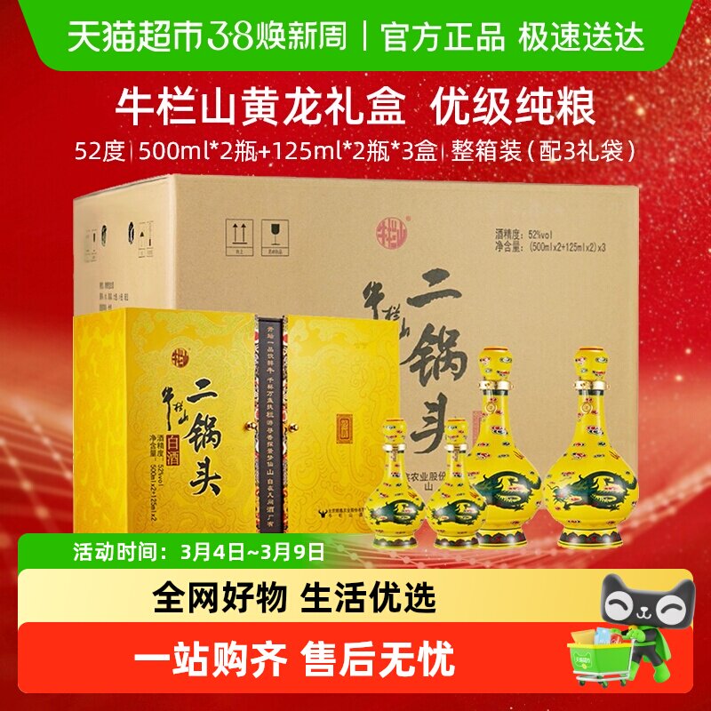 牛栏山二锅头白酒52度经典黄龙礼盒500ml*6瓶+125ml*6瓶清香型酒