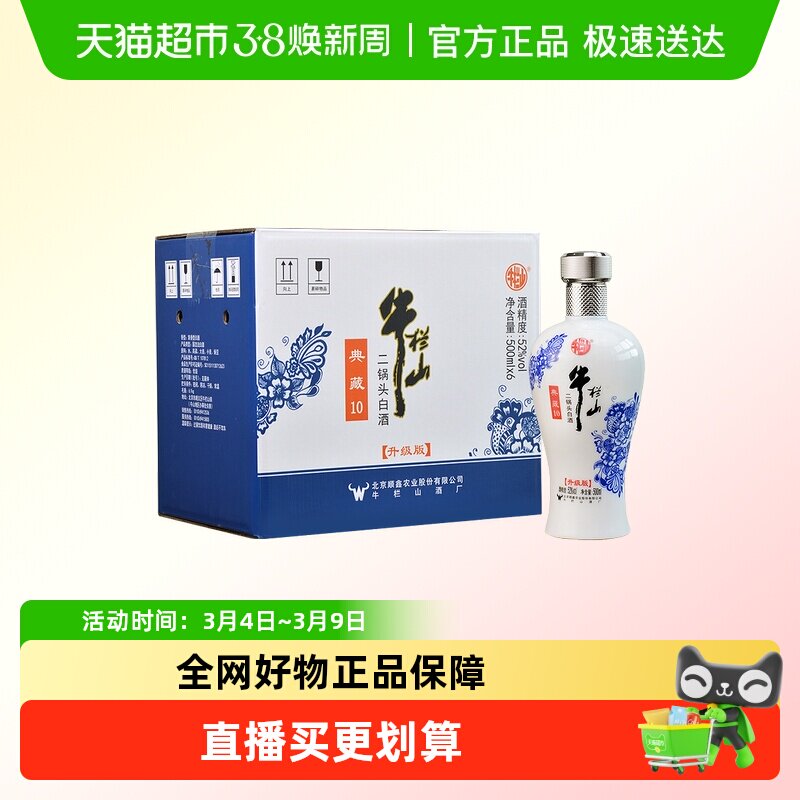 牛栏山二锅头白酒52度典藏10清香型500ml*6瓶纯粮酒整箱装青花瓷