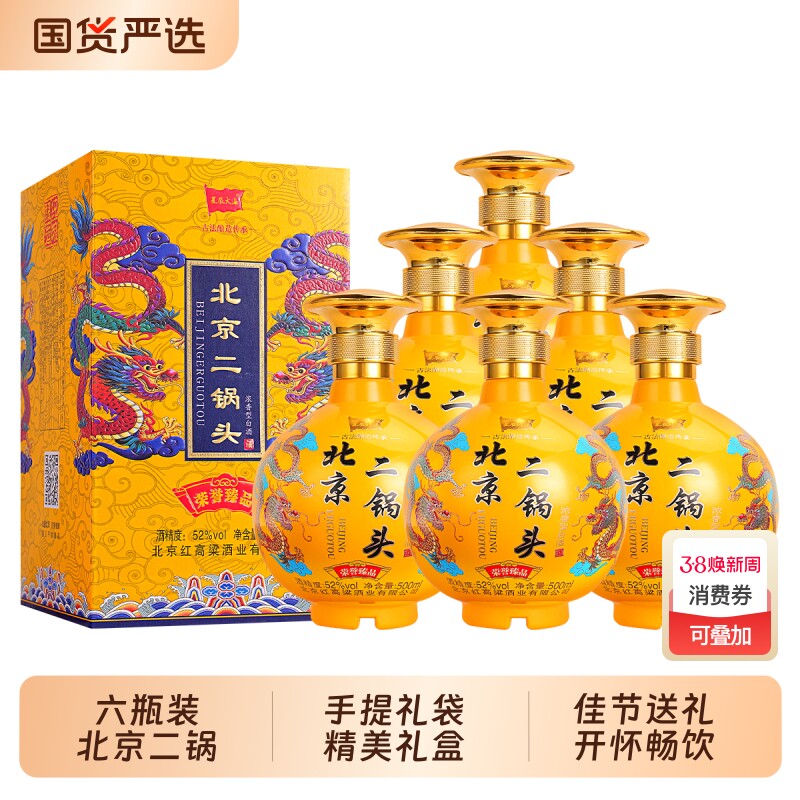 北京二锅头白酒整箱6瓶礼盒送礼品袋52度纯粮口粮自饮正品浓香型