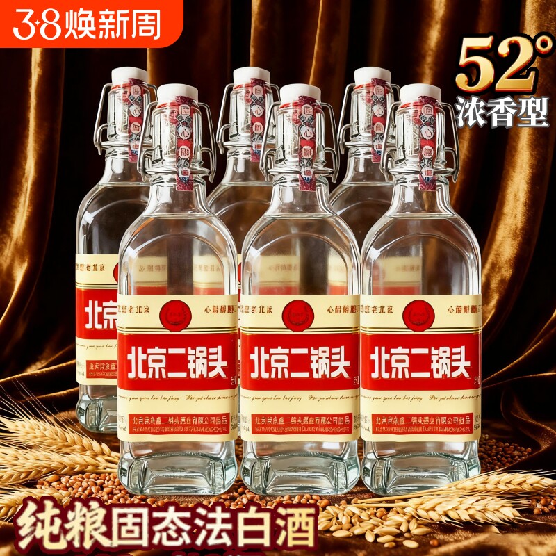 北京二锅头白酒52度浓香型纯粮出口小方瓶口粮酒酿造特价瓶装固态