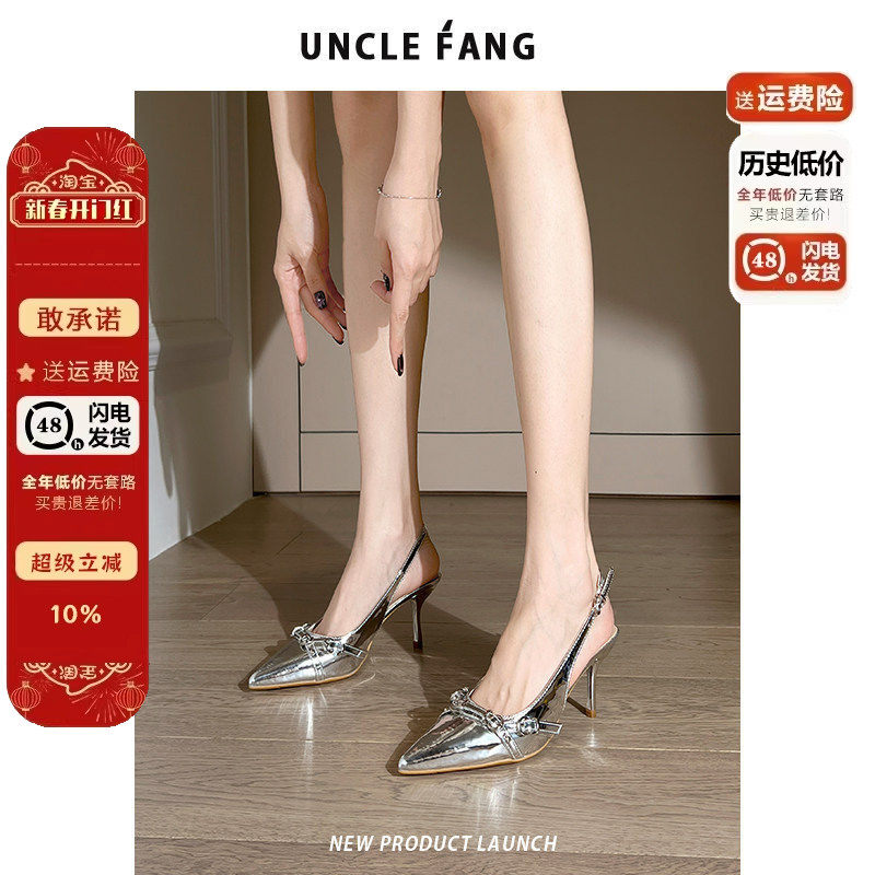 银色气质包头凉鞋皮带扣法式高跟鞋女通勤细跟尖头仙女配裙子单鞋
