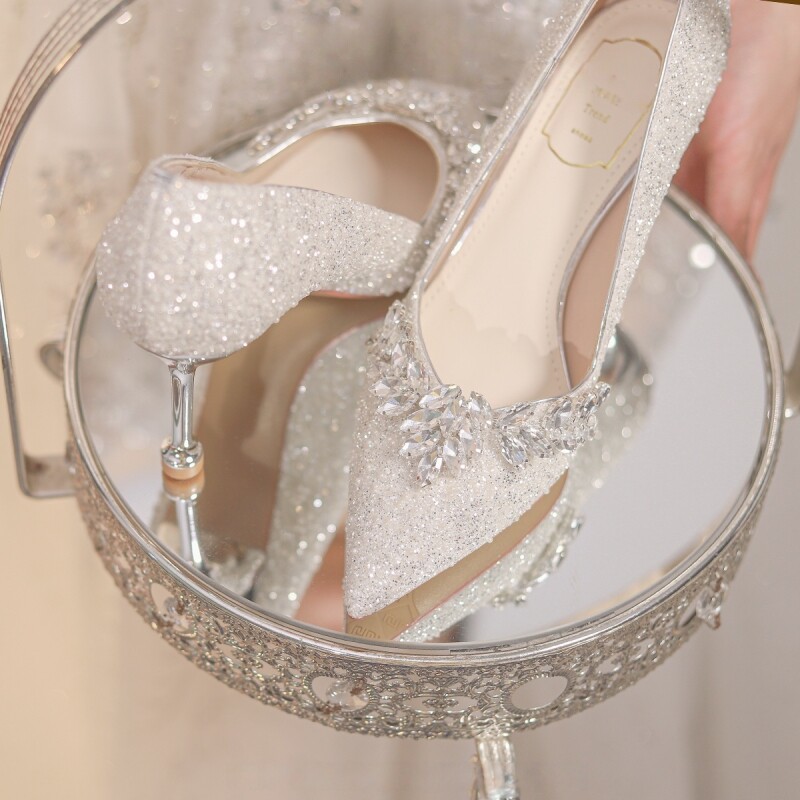 银色细跟婚鞋女主婚纱婚礼订婚新娘鞋2025新款夏季水晶绝美高跟鞋