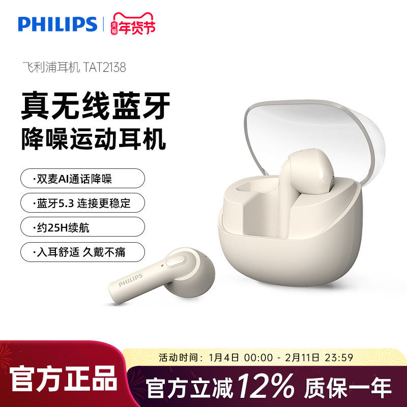 飞利浦TAT2138无线蓝牙半入耳式重低音手机通话降噪超长续航耳机
