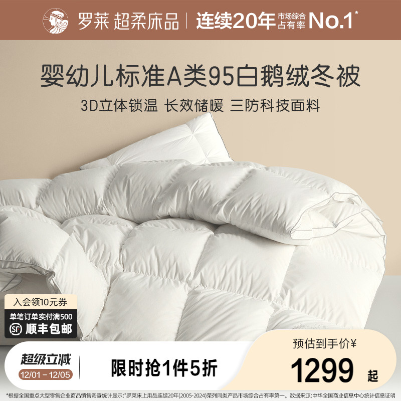 罗莱羽绒被子25秋冬新品180S全棉A类95白鹅绒被加厚冬被蓬松保暖
