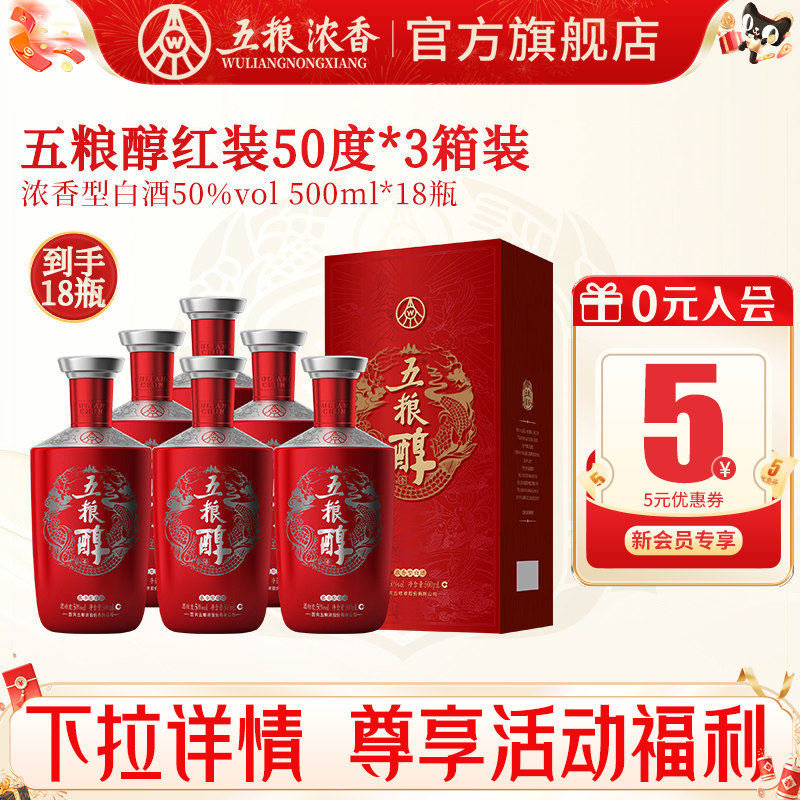 【到手18瓶】五粮醇红装50度500ml*6瓶*3整箱 浓香型白酒宴席婚宴