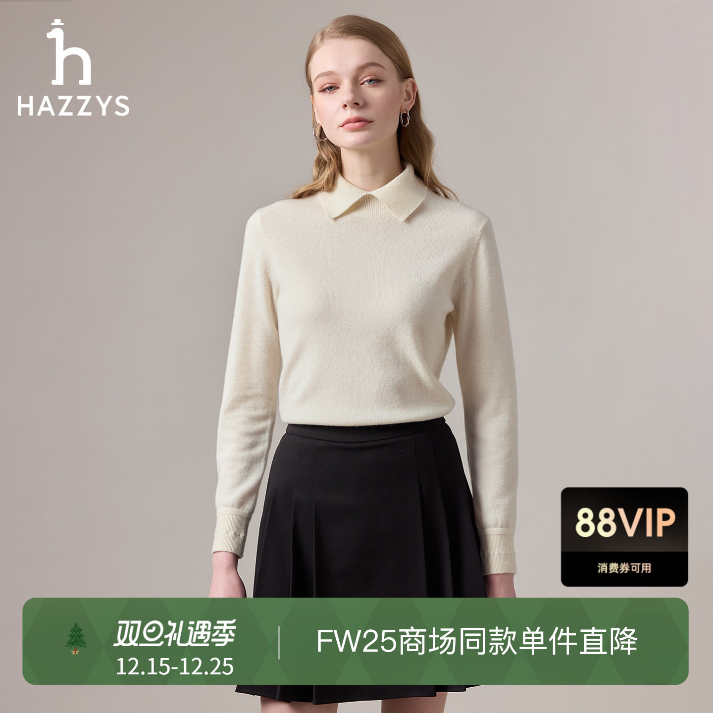 【宋佳明星同款】Hazzys哈吉斯翻领针织衫女25秋冬新品纯色羊绒衫