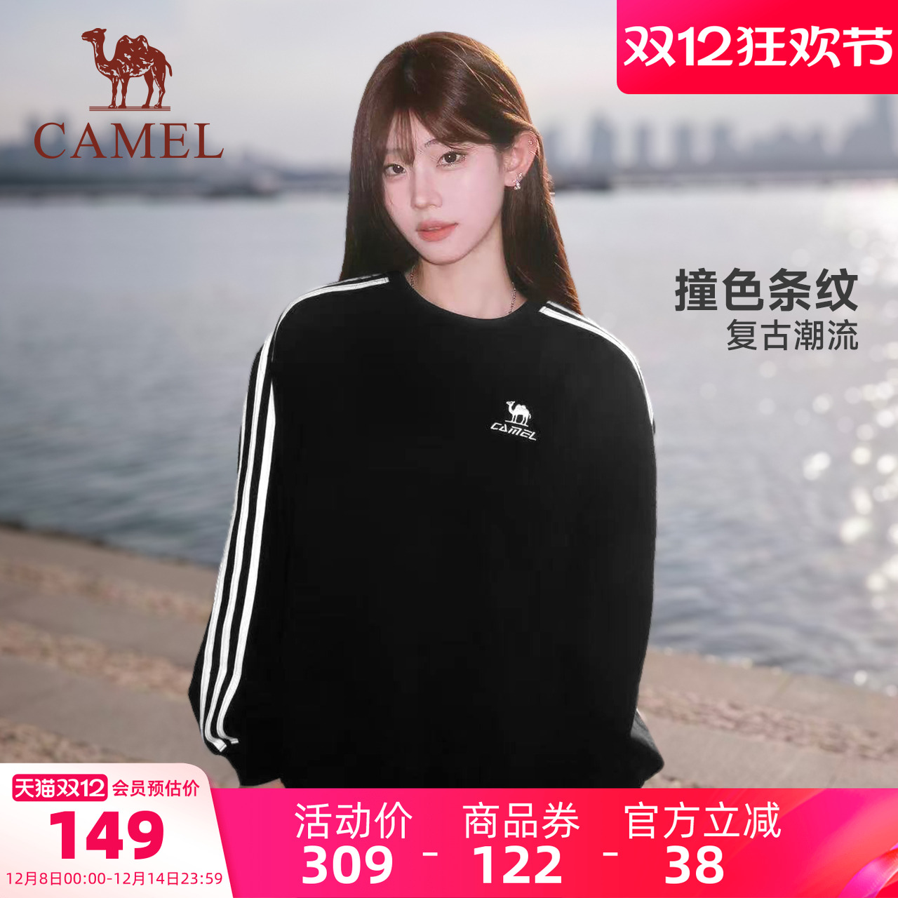 骆驼1930圆领卫衣长袖t恤男女情侣秋季休闲宽松条纹黑色套头上衣