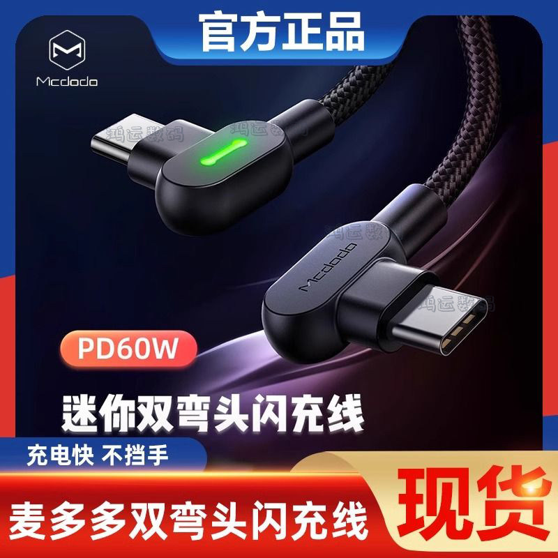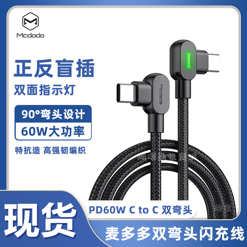 麦多多双Type-C数据线公对公双弯头PD20W快充Ctoc线适用苹果15promax手机macbook笔记本电脑快充线60W带灯光