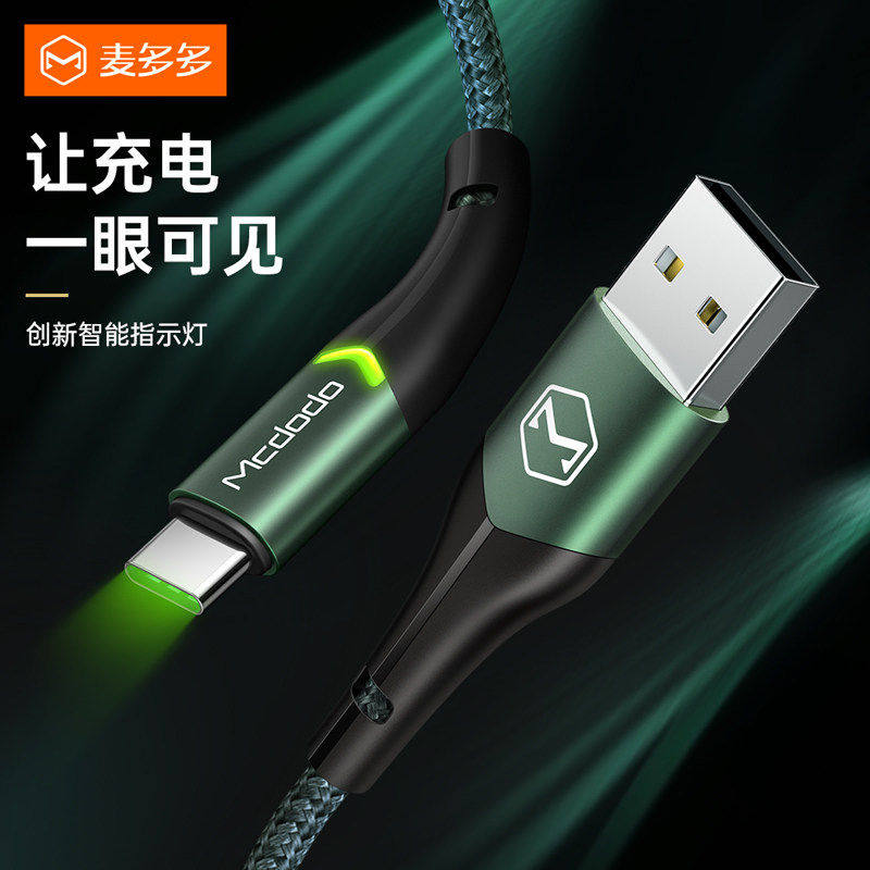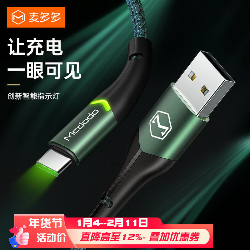 麦多多适用三星Type-c数据线小米10红米安卓手机USB A-C充电带灯QC3,0/QC4.0 27W快充电线iphone15-17慢充线