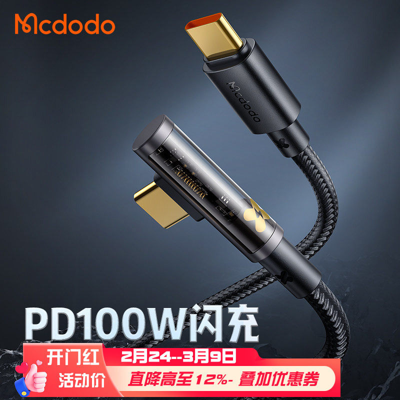 麦多多透明弯头数据线pd100W闪充适用于苹果14iPhone15ProMax手机平板华为手游电脑Type-C弯头90°超级快充线