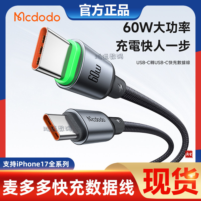 麦多多双头Type-C数据线60W快充3A带灯适用苹果17/Air/16/15ProMax/Macbook笔记本iPadPro充电线数据传输