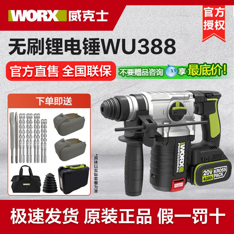 威克士锂电锤WU388充电式两用脉冲打瓷砖电镐方柄388F无刷冲击钻