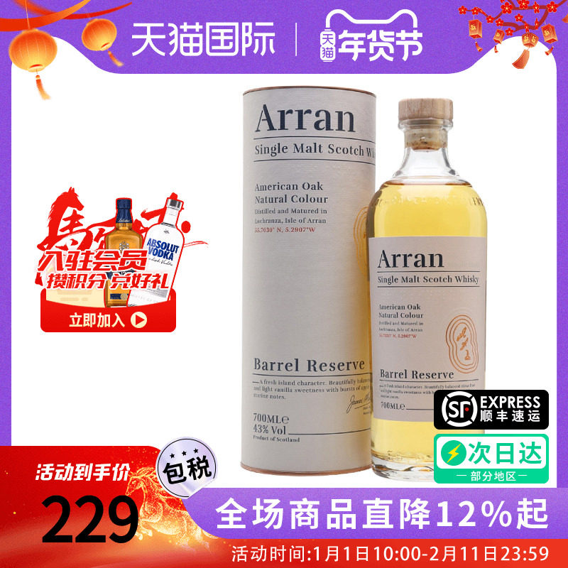 欧洲直邮Arran艾伦苏格兰单一麦芽威士忌谷物酿造醇厚绵柔0.7L