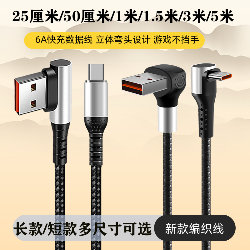 66W加长快充弯头USB盲插数据线typec通用超级快充车载Type-C快充充电线黑色双弯头适用苹果15/16华为充电线