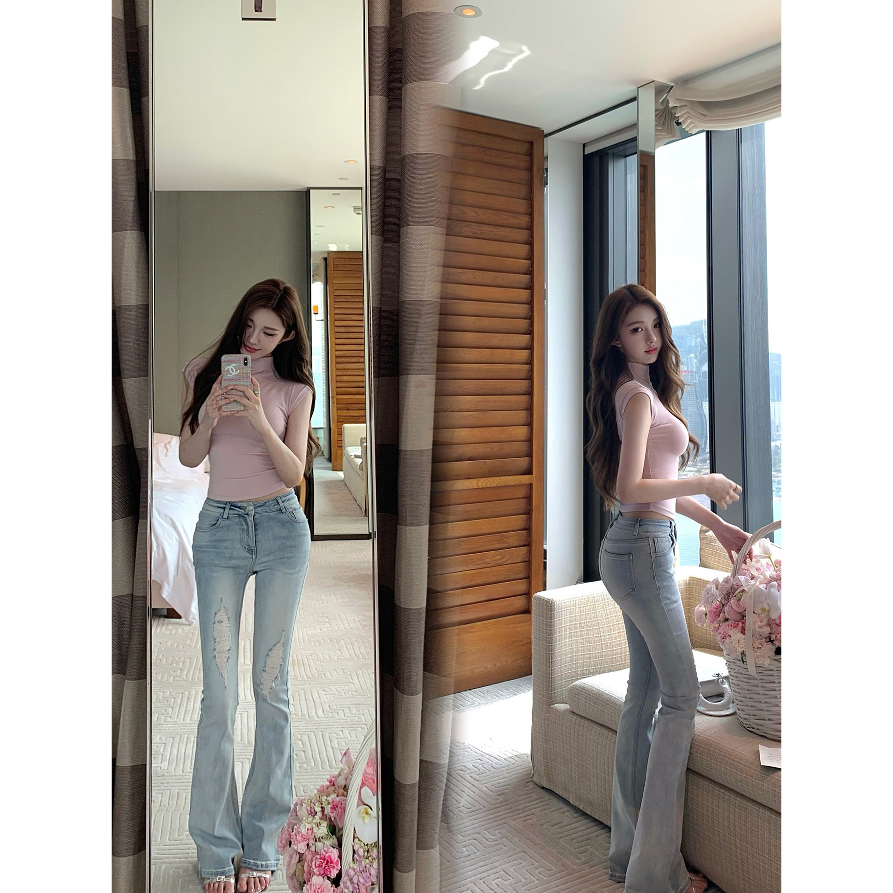 Momoshero【冰萃"海盐danim"】Gu韩女腿精感!特调破洞微喇牛仔裤