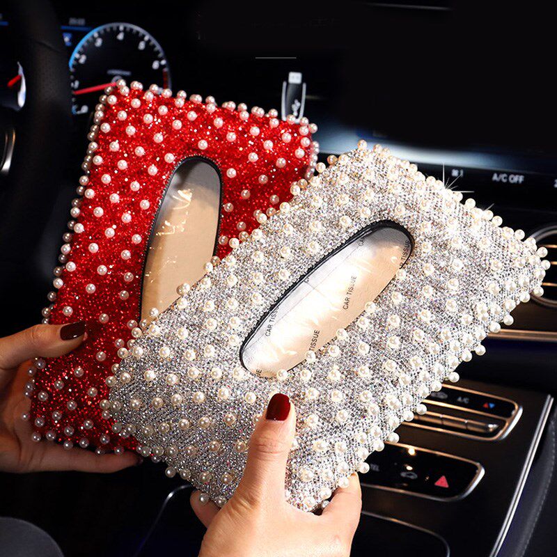 汽车车载纸巾盒座式抽纸盒女可爱创意珍珠镶O钻车内用品装饰烟灰