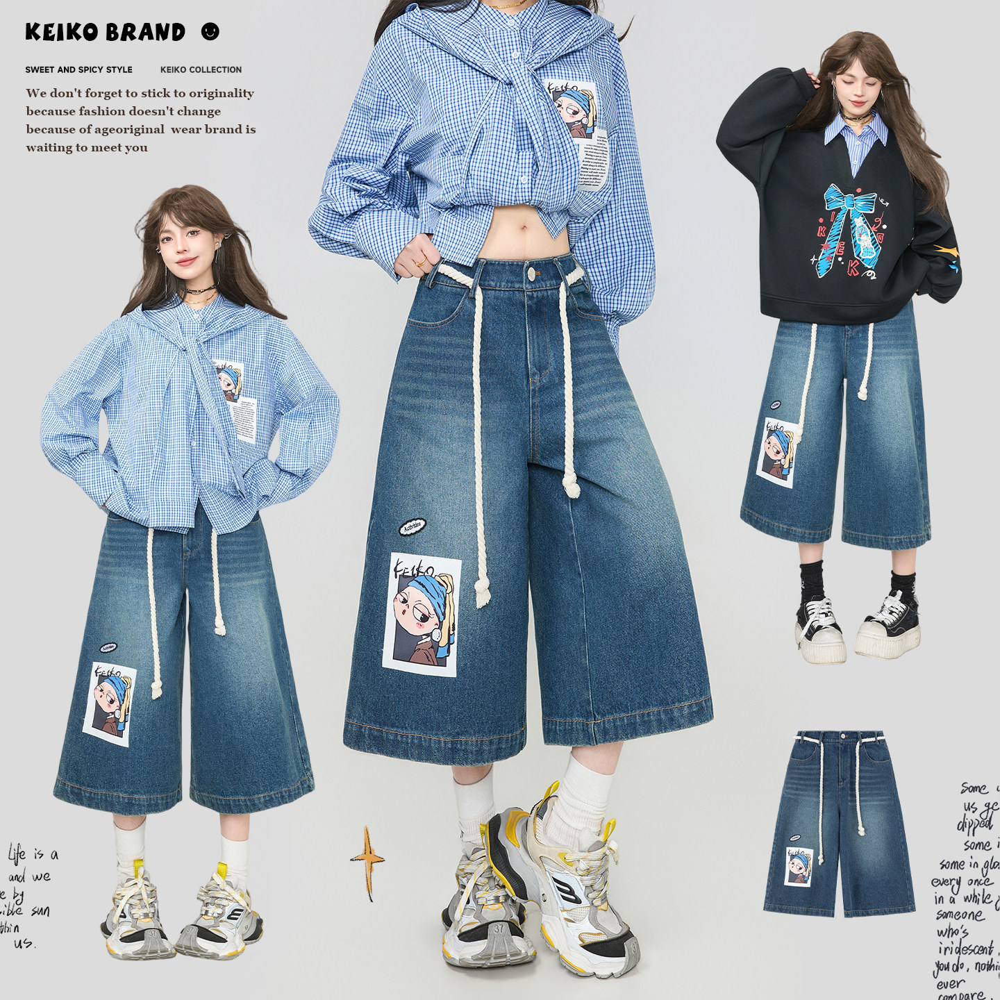 KEIKO 俏皮少女风直筒七分牛仔裤2026春夏水洗宽松阔腿短裤中裤子