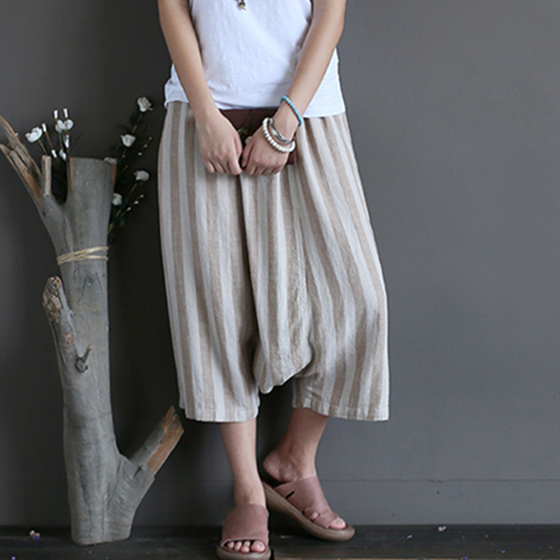 春夏棉女装文艺宽松大码条纹阔腿裤瑜伽休闲裤禅意茶服裙裤七分裤