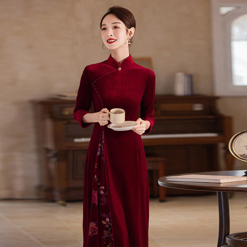 连衣裙秋冬金丝绒红色奥黛旗袍女中长款妈妈婚宴装礼服敬酒服喜服