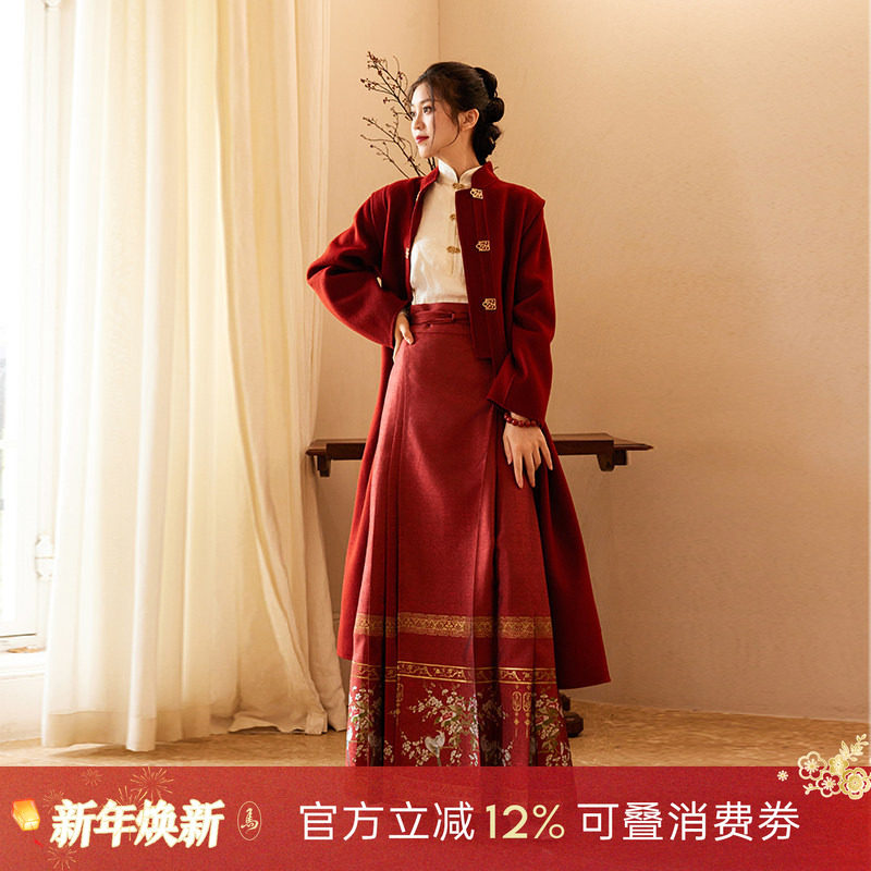 听旬嘉姻秋冬拜年汉服女改良长款红色纯羊毛大衣过年服婚服敬酒服