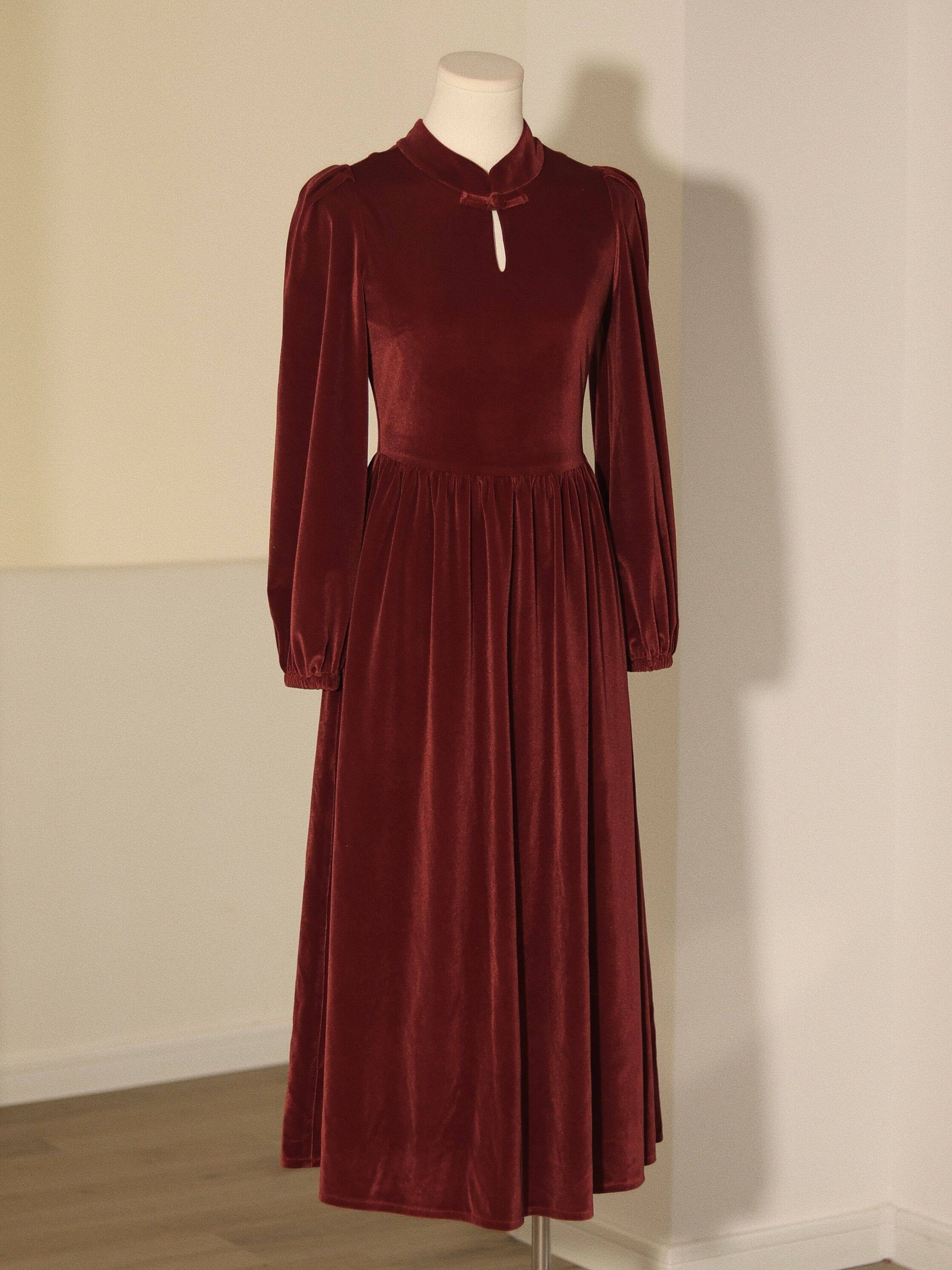 喵吉新中式长袖收腰敬酒服订婚裙小个子长款丝绒红色连衣裙女秋冬