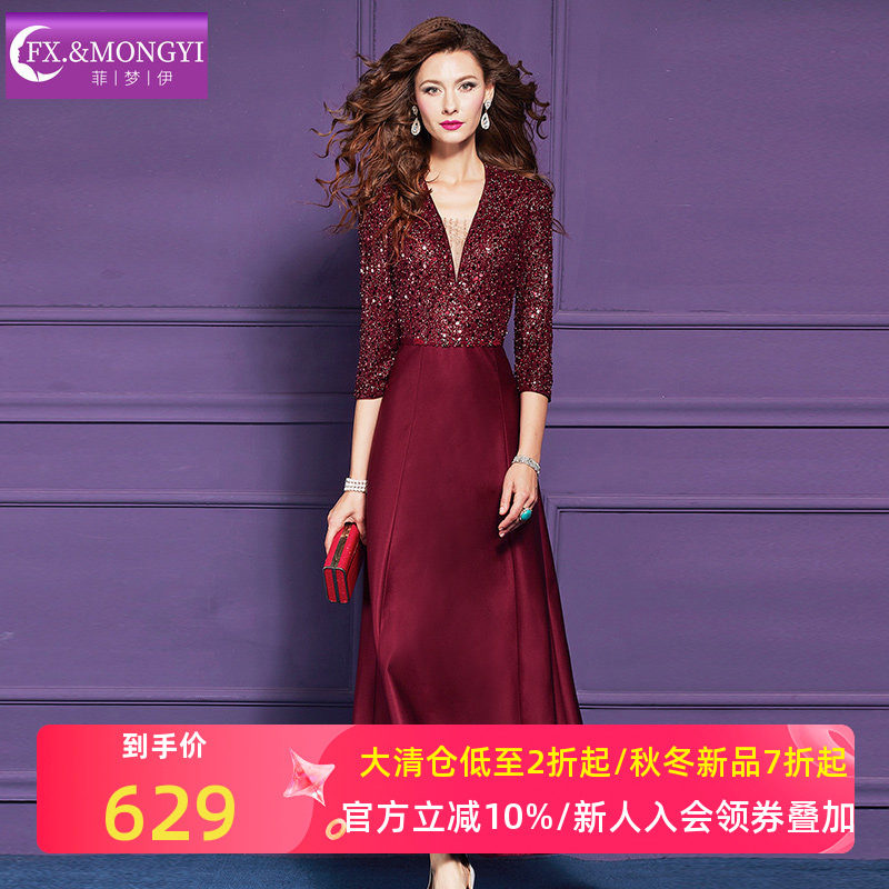 菲梦伊钉珠亮片红色连衣裙女冬季轻熟名媛本命年中长款礼服敬酒服