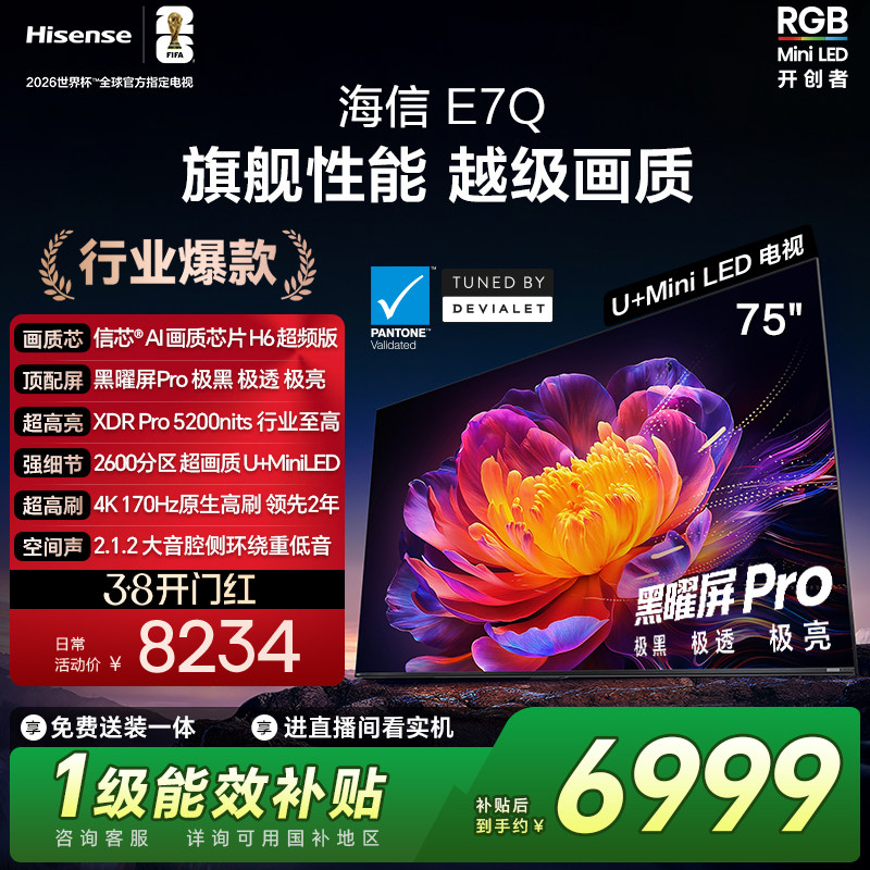 海信电视E7Q 75英寸 信芯芯片H6超频 黑曜屏Pro 5200nits 电视e7n