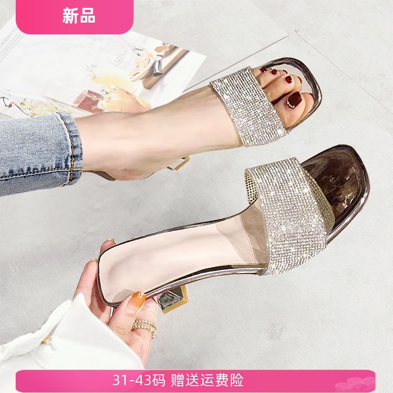 水晶跟拖鞋女夏外穿粗跟2026新款时尚水钻高跟凉拖潮小码鞋313233