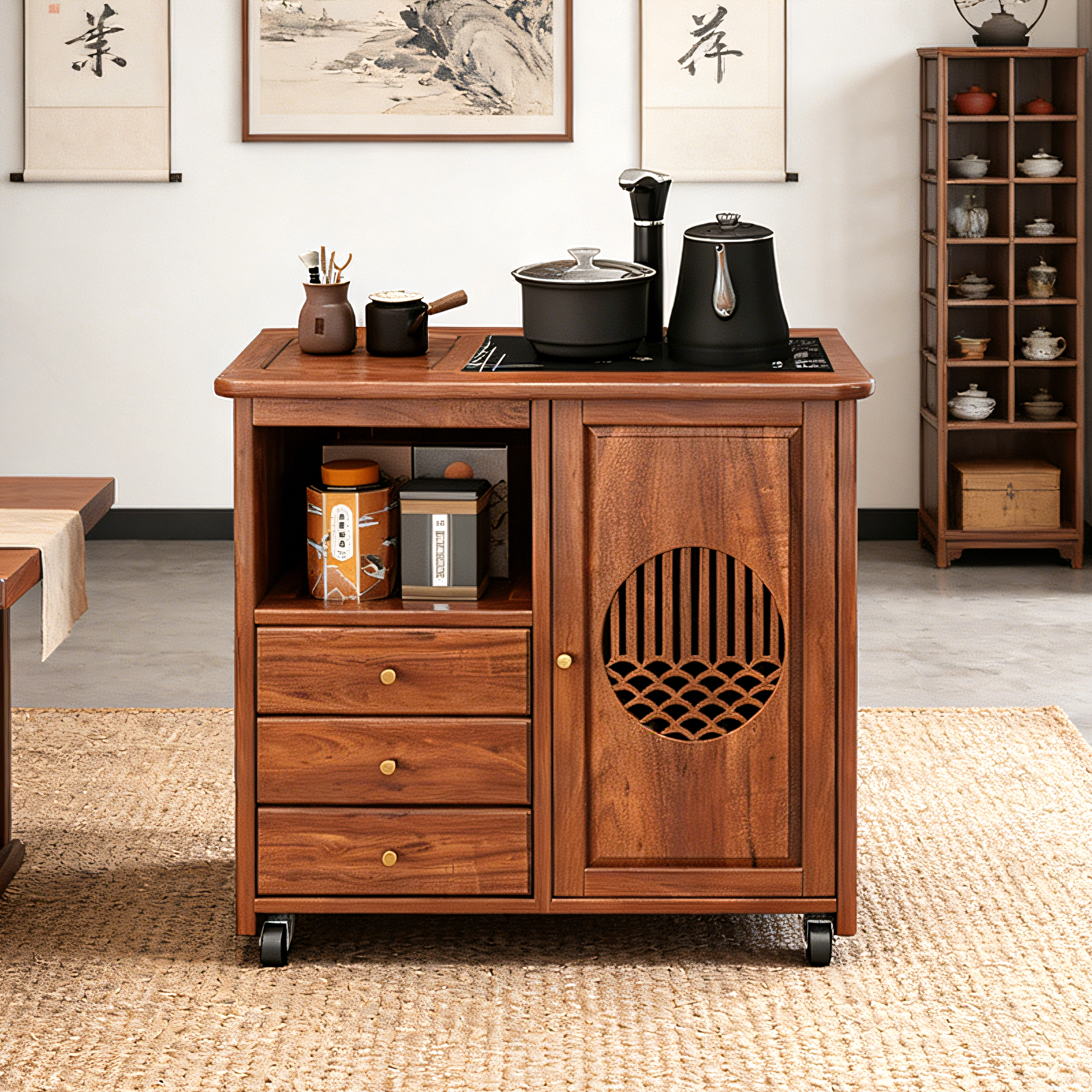 实木茶几客厅家用移动储物柜中式带轮茶水柜茶具收纳柜阳台小茶桌