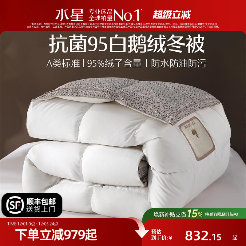水星家纺羽绒被95白鹅绒冬被加厚保暖抗菌蓬松被子春秋被结婚被芯