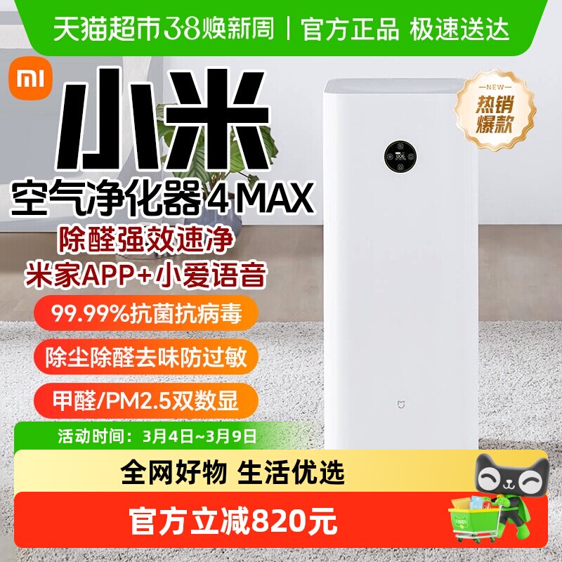 小米官旗米家空气净化器4MAX除甲醛雾霾家用双数显吸烟宠物净化机