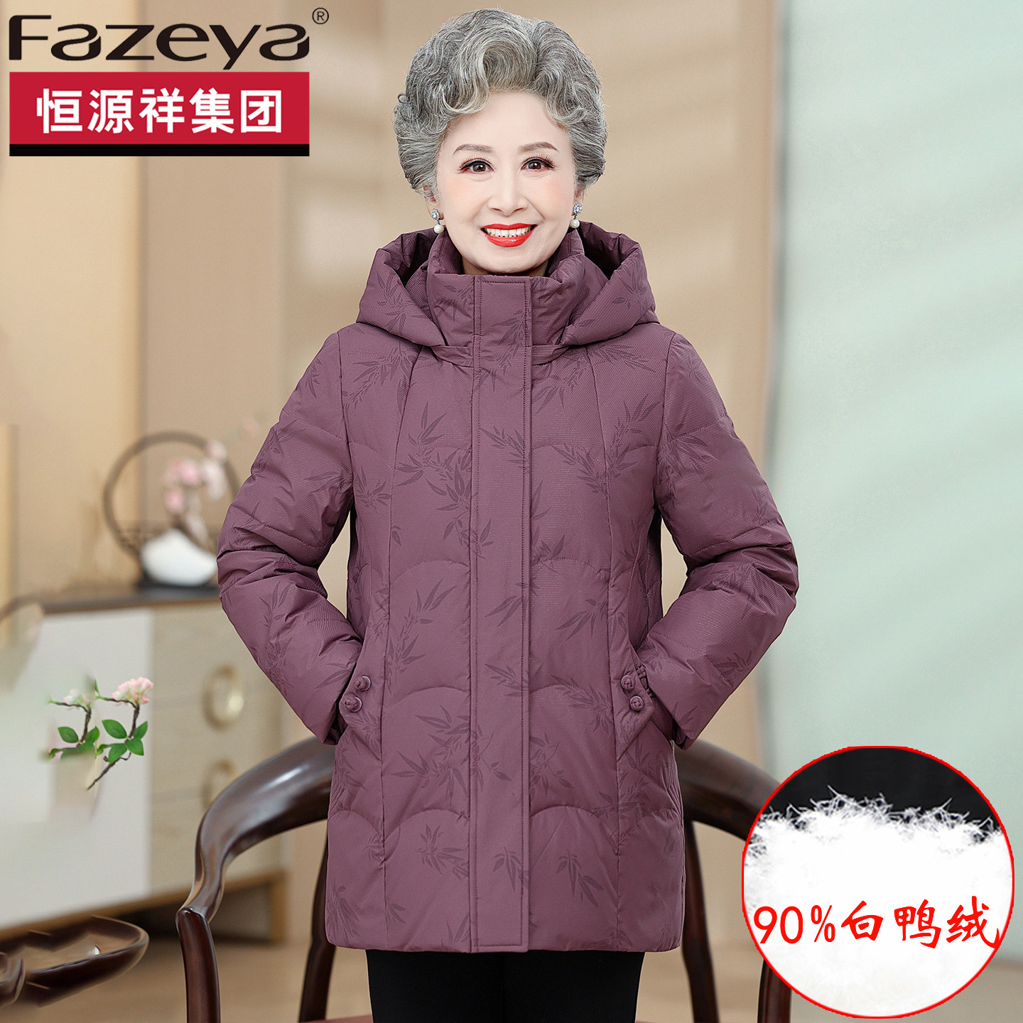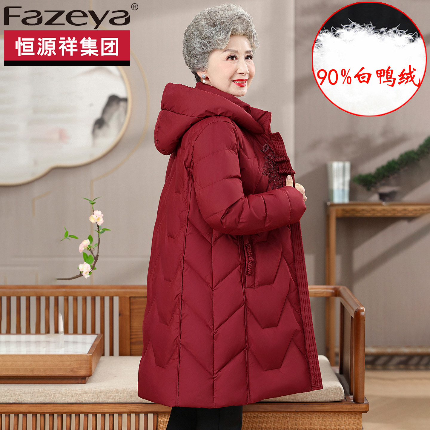 恒源祥集团FAZEYA中老年妈妈羽绒服保暖中长款白鸭绒奶奶时尚外套